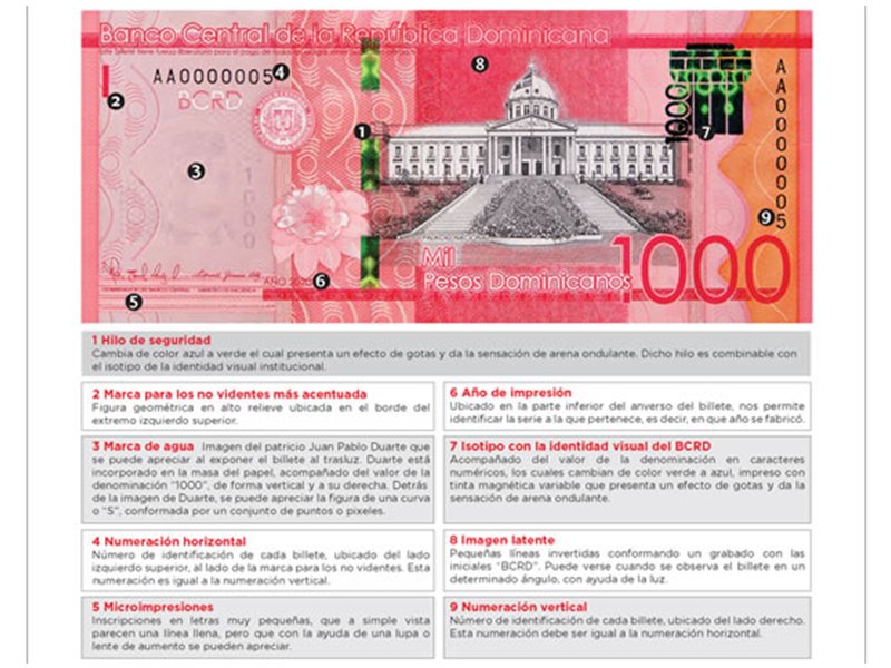 Este billete contiene las mismas características de seguridad de los billetes de RD$1,000 pesos dominicanos actualmente en circulación, los cuales mantendrán su fuerza liberatoria para el pago de todas las obligaciones públicas y privadas.